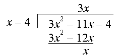 So (3x2 − 11x − 4) ÷ (x − 4) = 3x + 1