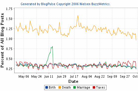 According to this chart from Nielsen BuzzMetric's BlogPulse [no longer available], bloggers are about 4.5 times as likely to write about death as they are to write about taxes, births or marriage: