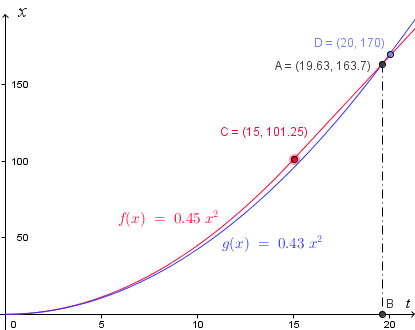 We can see the curves intersect at time `t = 19.63\ "s"`, or point A `(19.63, 163.7)`, as we found in the calculation above. This means they have covered the same distance (`163.7\ "m"`) at that time, so that's when the blue car passes the red car.