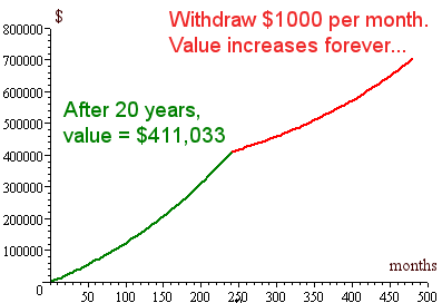 2. For interest, let’s see what happens when Tom takes out the same amount that he puts in. That is, he withdraws $1000 per month. Once again, the money lasts forever and continues to increase in value. Cool, huh? This is the power of compounding.